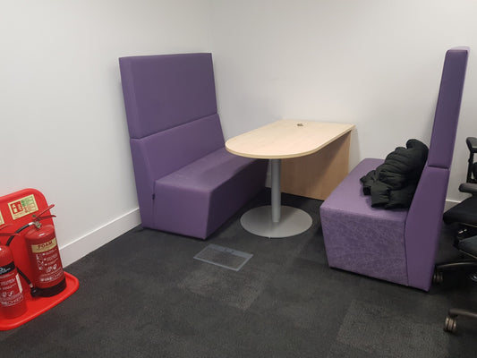 Cubicle Booth Seating in purple with breakout meeting table W:120cm D:67cm H:134cm