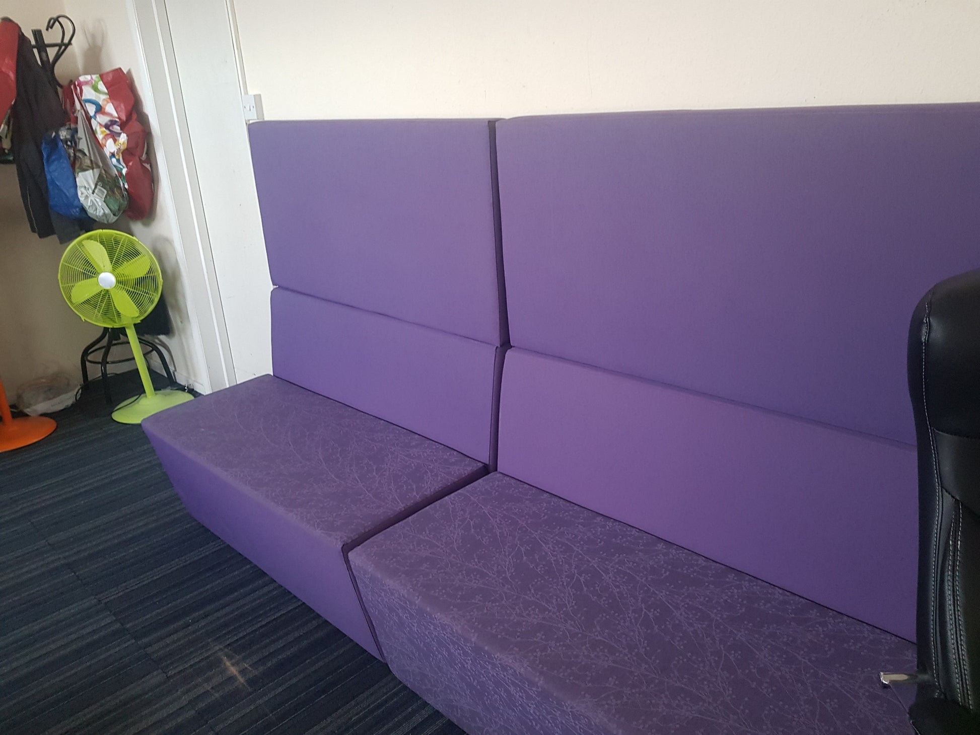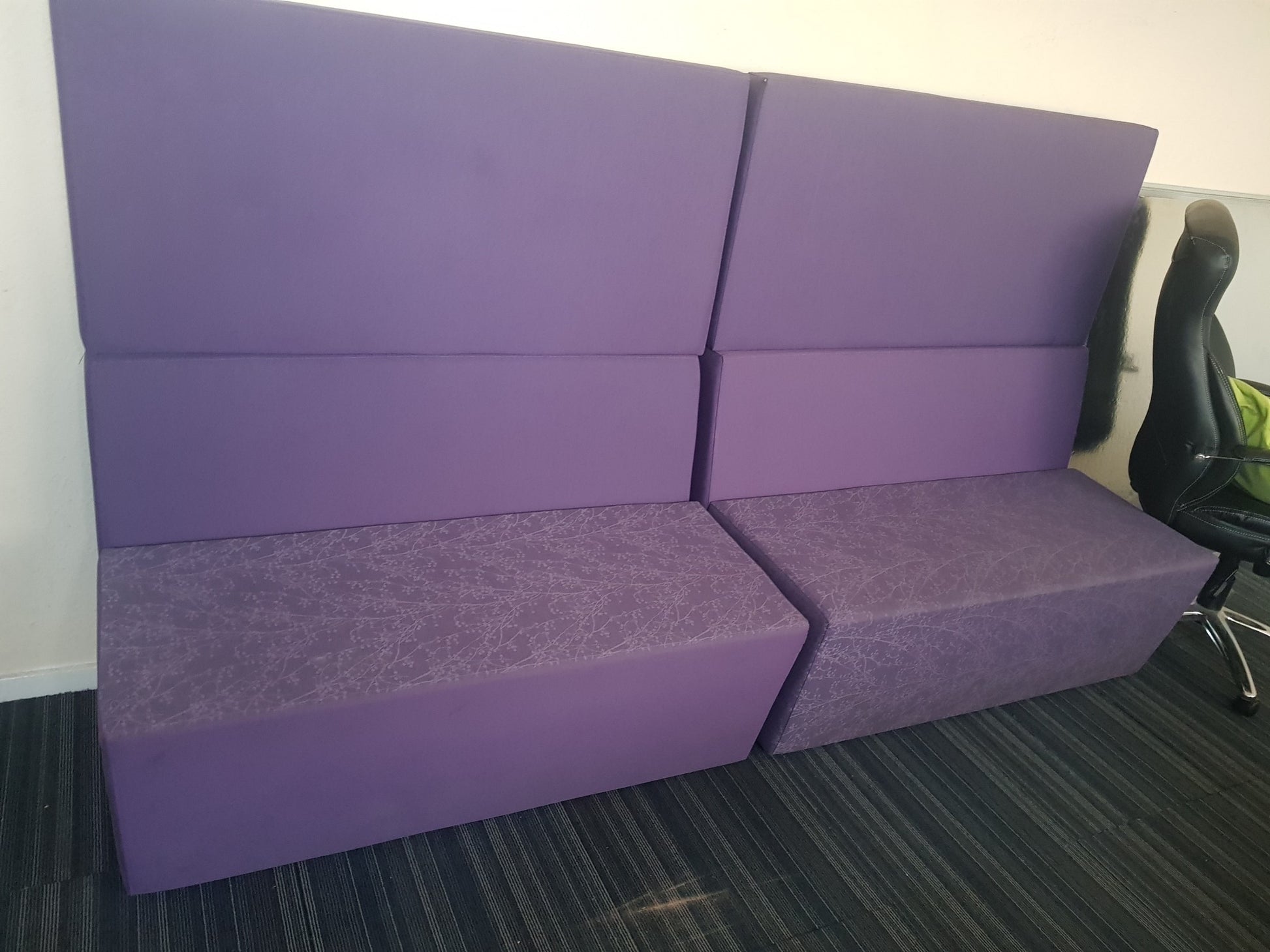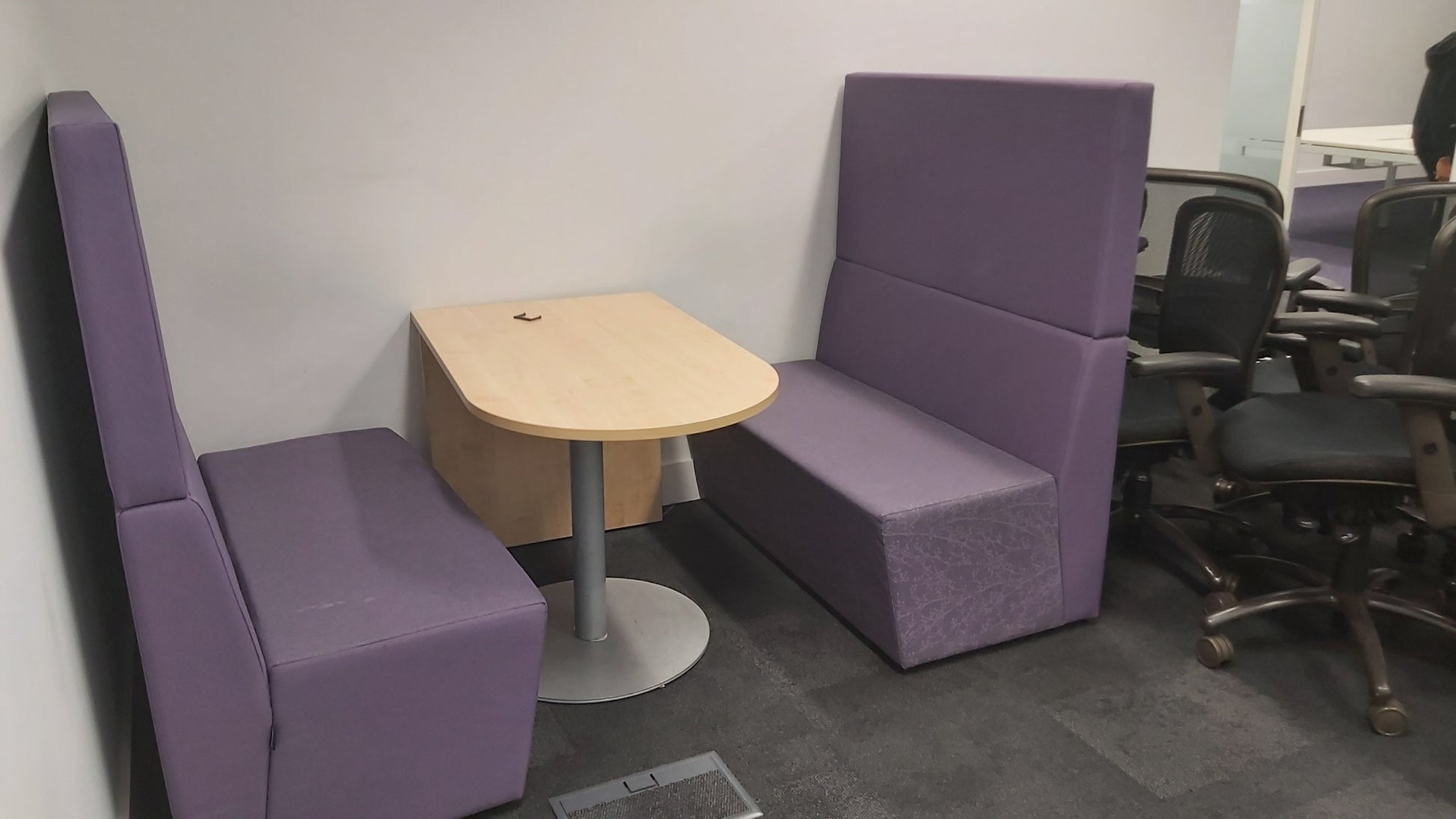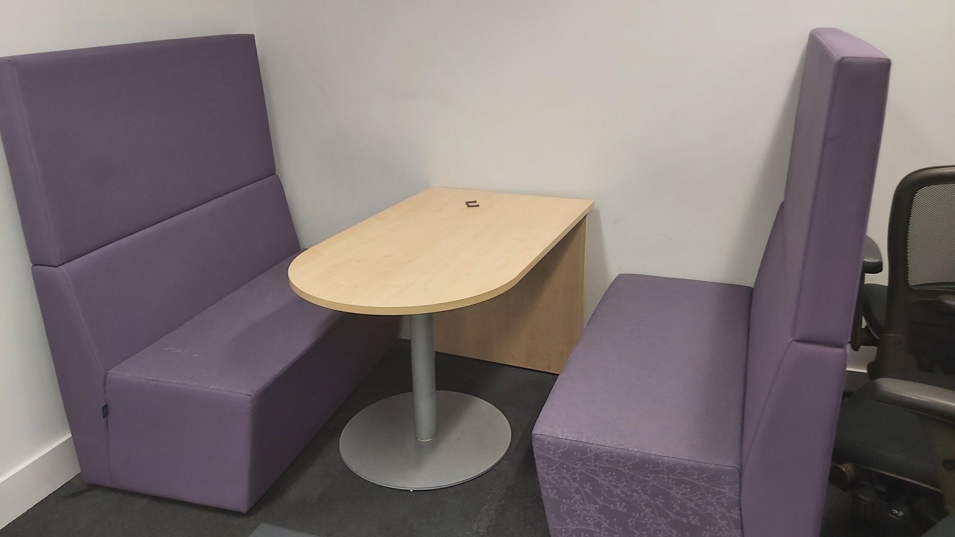Cubicle Booth Seating in purple with breakout meeting table W:120cm D:67cm H:134cm