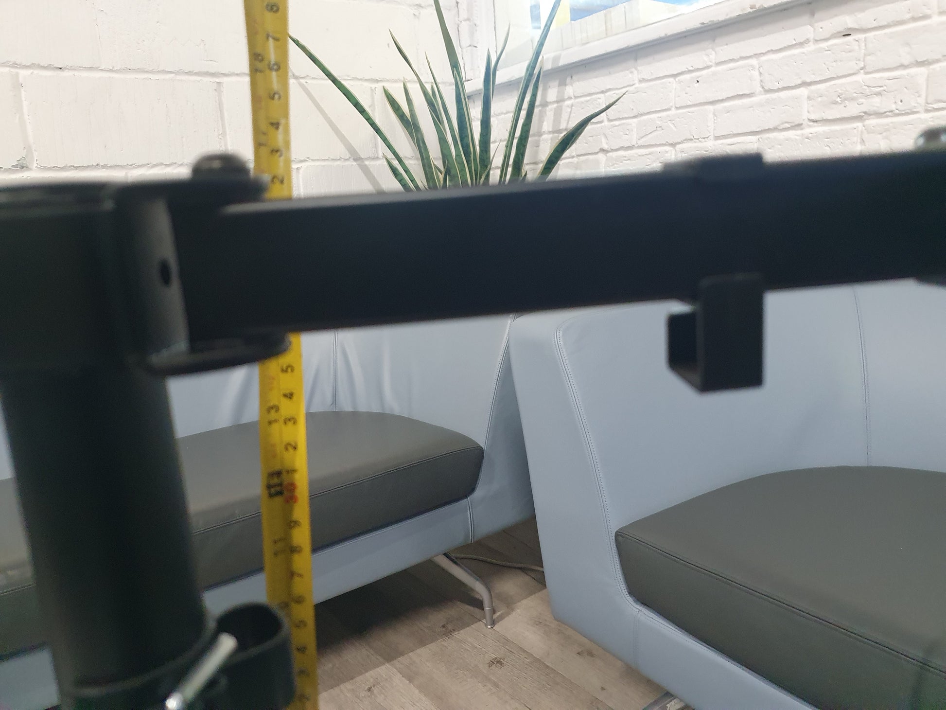 Freestanding Dual Monitor Stand with Sleek Glass Base and Adjustable Arms