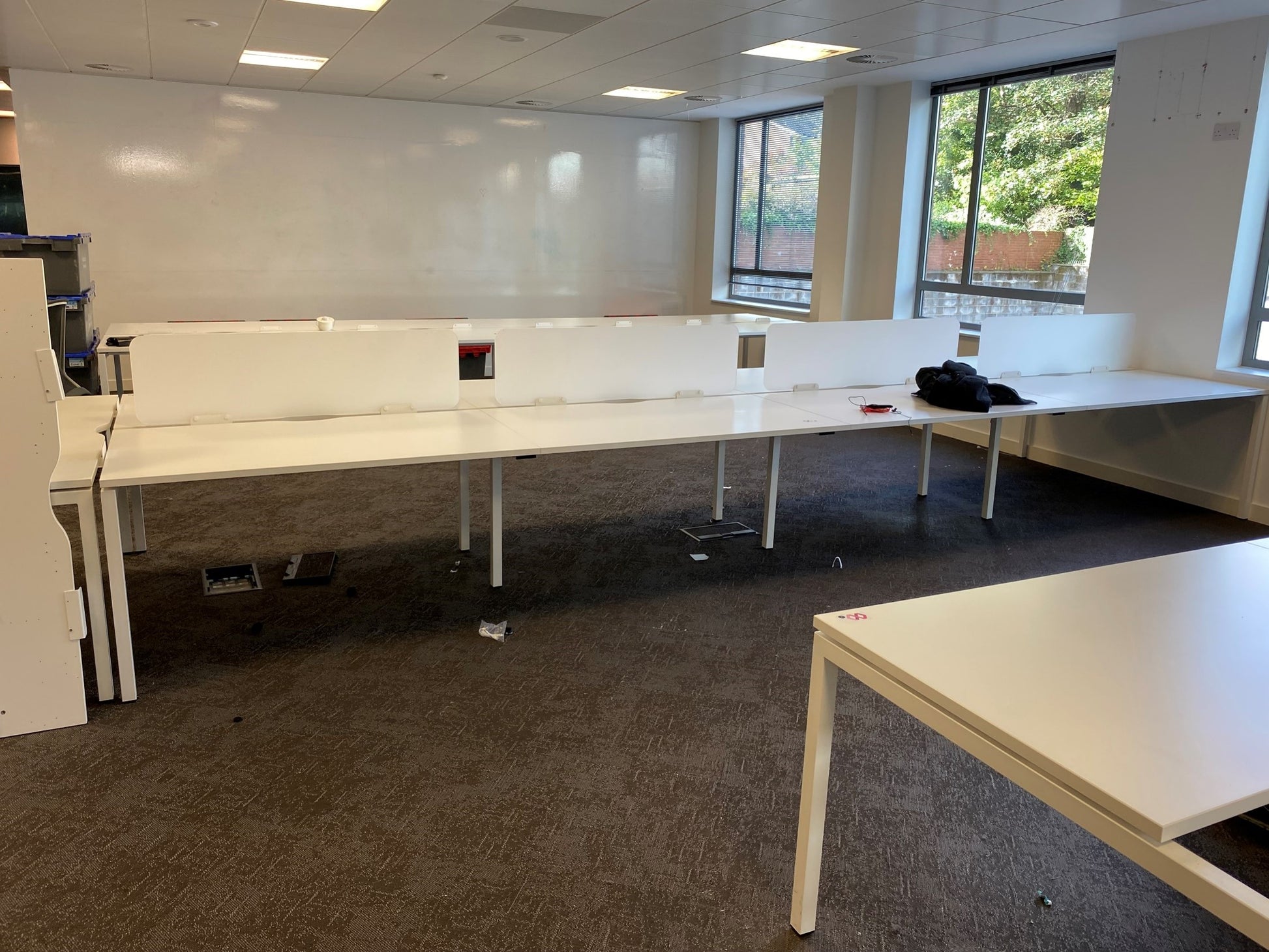 Pre-Owned White Office Pod Desk - 8 Seater- 140cm x 80cm per tabletop